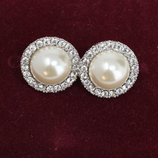 This 18-inch double-strand pearl necklace and pierced earrings set is a replica of one owned by former First Lady Jacqueline Kennedy. She had many pearl jewelry items which she wore quite often. This lovely hand-knotted necklace is made with large 12mm white shell pearls strung on silken cords. Its beautiful rhodium-plated silver box clasp is accented with a simulated sapphire center stone surrounded by simulated diamonds. The matching round halo earrings have large pearl centers surround by a ring of simulated diamonds. This classic pearl jewelry set is perfect for the office, church or a special event, especially a wedding. It would also make a wonderful birthday gift or anniversary gift. The set is in excellent condition and has never been worn. It comes in a special presentation box along with certification. Don't miss the opportunity to get this lovely white shell pearl necklace and earring set today. ORDER NOW!