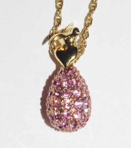 This gorgeous necklace designed by Joan Rivers has a pendant that is egg-shaped and covered with gorgeous pink faceted stones. At the top of the pendant is a beautiful gold tone heart with a bird standing on it. The pendant is 1-1/2" long, and the chain is 30" long. This necklace is perfect for work, church or a special occasion. It would also make a great gift for someone. This necklace is in Like New Condition and comes in an attractive gift box. Don't miss the opportunity to get this beautiful designer necklace today. Buy it now.