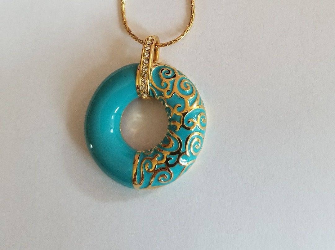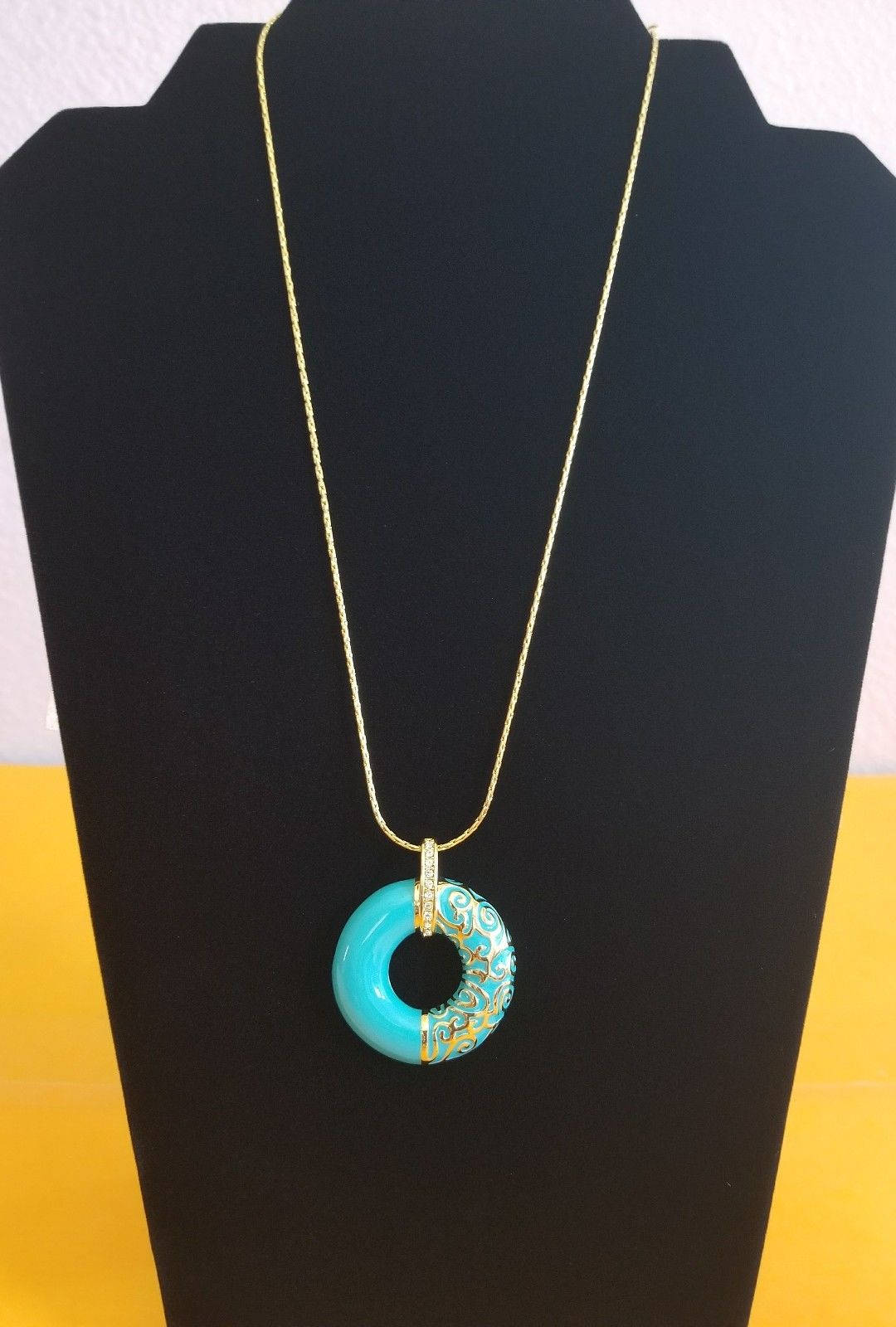 This is a beautiful replica by Camrose & Kross of a Parisian Love Circle Necklace owned by Former First Lady Jacqueline Kennedy. It is hand-painted in turquoise enamel with 24kt gold plating and has 10 clear Swarovski crystal elements. The chain is 18 inches long with a 3 inch extension and a lobster claw clasp. This piece comes with the Certificate of Authenticity and a velour covered gift box. This necklace is perfect for work or any occasion and would also make a wonderful gift for someone. Don't miss the opportunity to get this gorgeous necklace today. Buy it now.
