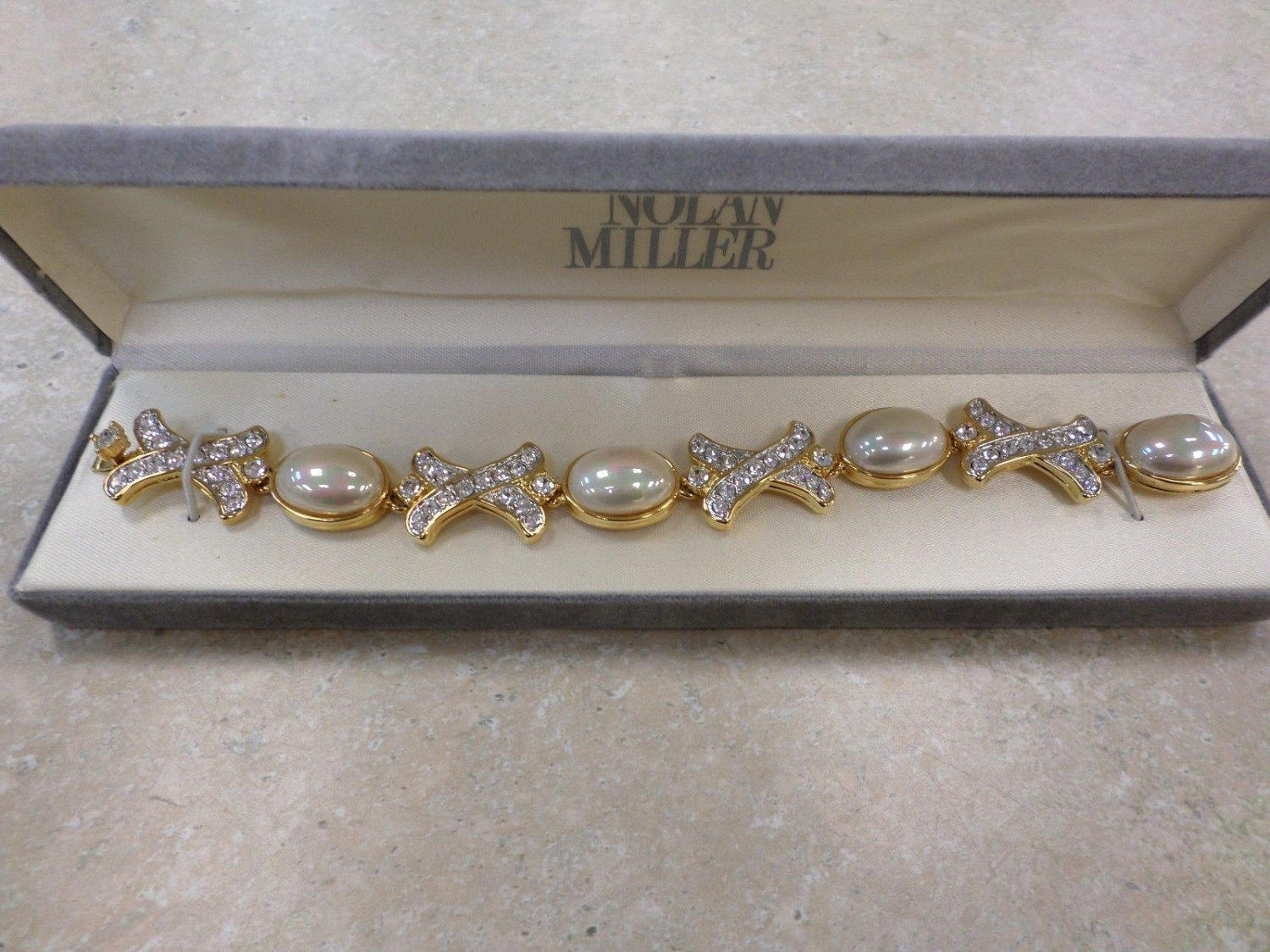This gorgeous bracelet by designer Nolan Miller is known as his X's and O's bracelet. It has lots of beautiful crystals and large oval faux pearl cabochons. It is "drop dead gorgeous" and calls to be worn for a special occasion such as a wedding. The bracelet is 7-1/2" long and 3/4" wide, and is in Like New condition. Don't miss the chance to own this beautiful designer bracelet today. Buy it now.