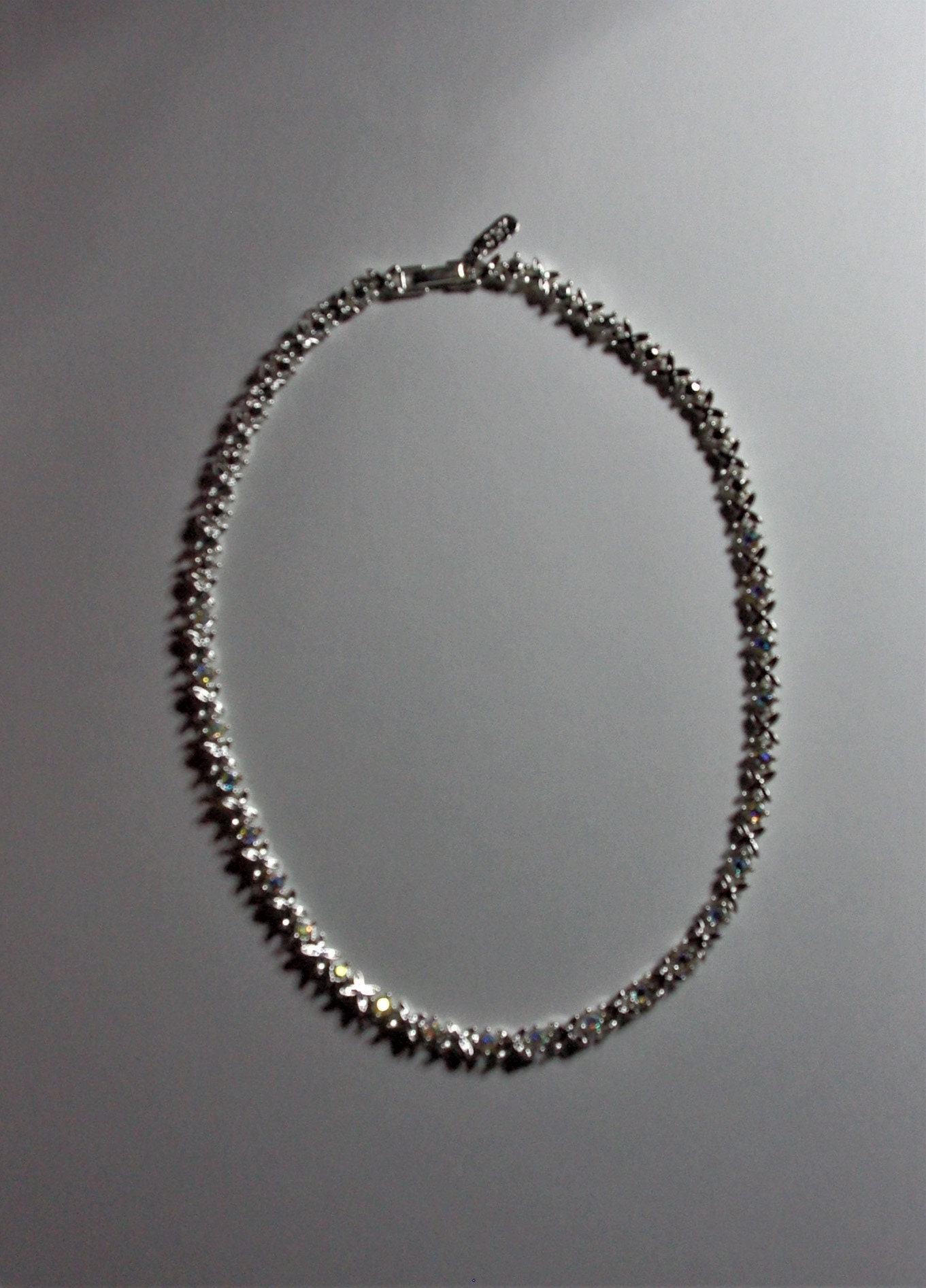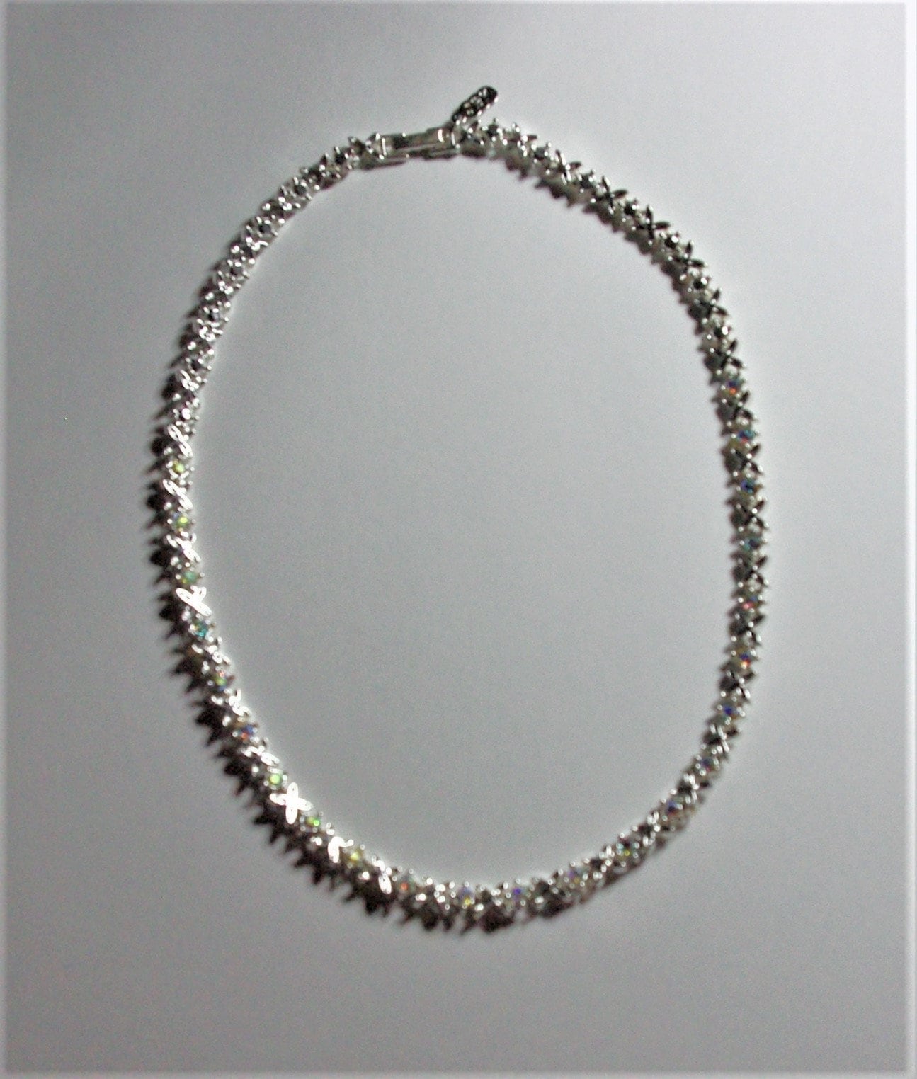 This is a replica of a necklace worn by Former First Lady Jacqueline Kennedy. It platinum plated and has beautiful faceted aurora borealis stones. The necklace is 17" long with an easy-to-use and secure fold-over clasp. This necklace is perfect for all your special occasions. It would also make a great gift for someone. It is in Like New Condition and comes in a velour-covered gift box along with a Certificate of Authenticity. Don't miss the opportunity to get this magnificent necklace set today. Buy it now and add it to the heirlooms you plan to pass on to your family.