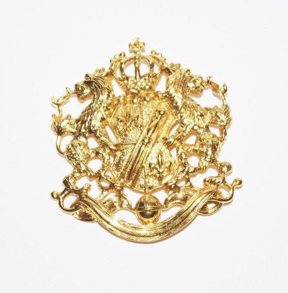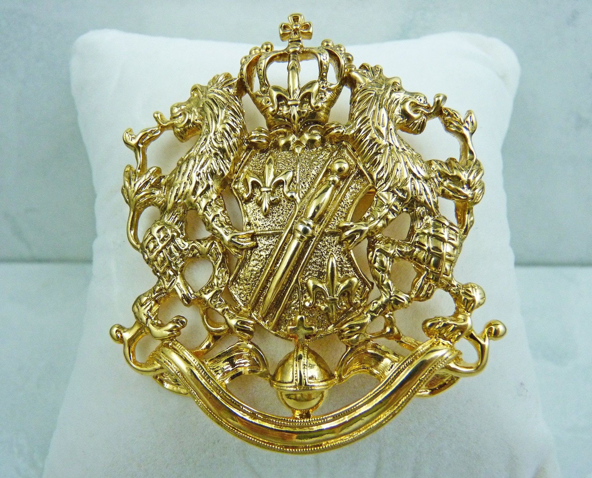 This beautiful brooch signed by Joan Rivers is in the shape of a Coat of Arms with a shield, griffins and a crown at the top. The entire piece is done in gold tone metal with a raised design. It is so beautiful and so classic. Measurements are 2" across x 2-1/2" tall. This pin is perfect for work, church or a special occasion. It would also make a great gift. It is in Like New Condition and comes in an attractive box. Don't miss the opportunity to get this gorgeous designer brooch today. Buy it now.