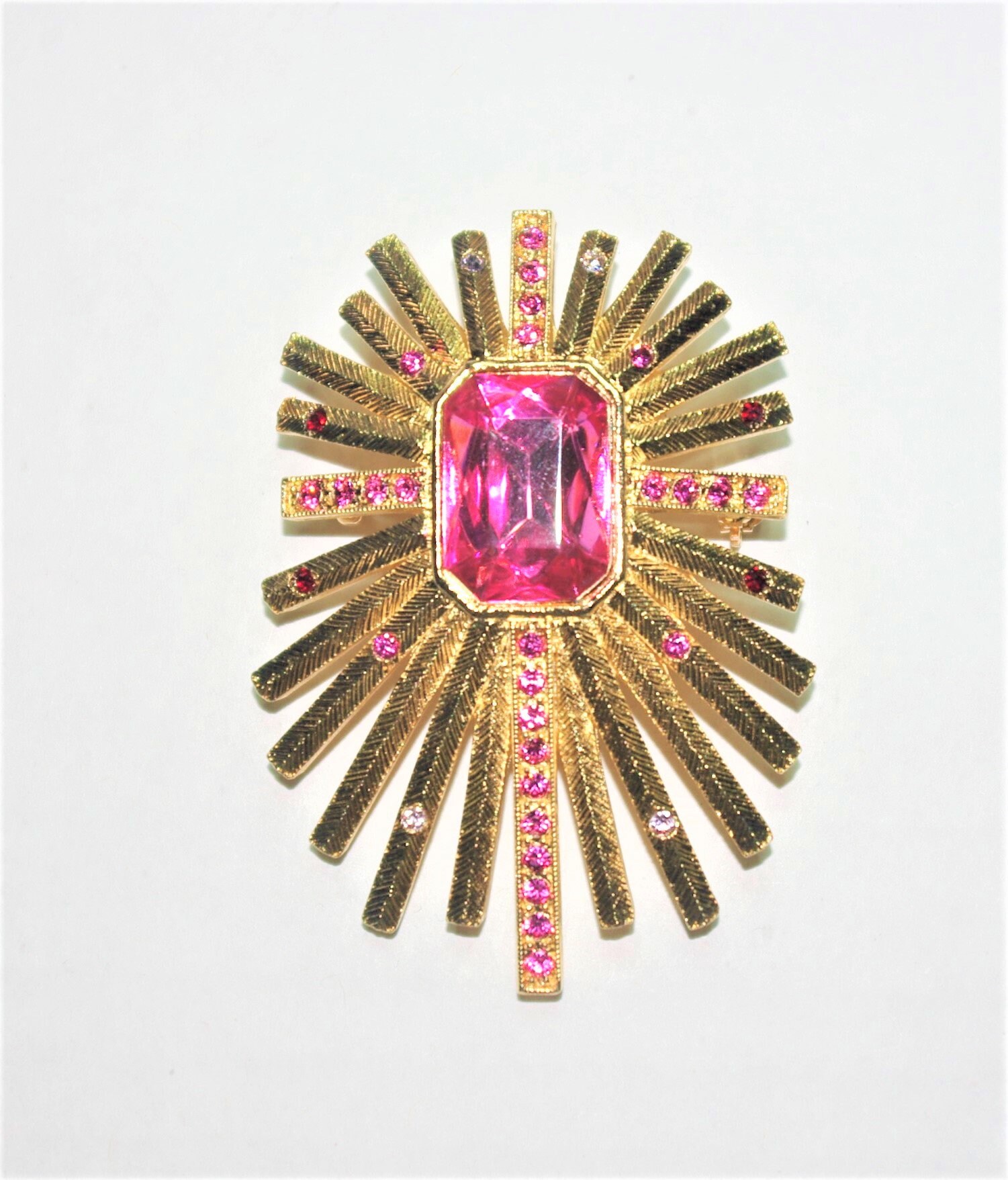 This is a replica of a brooch owned by Former First Lady Jacqueline Kennedy. It is gold plated and has a large pink stone in the center. There are lots of tiny pink stones sprinkled around the arms of the brooch as accents. This brooch measures 2-1/2" tall and 2" wide. It is perfect for work, church or a special occasion and would also make a great gift for someone. It is in Like New Condition and comes in a velour-covered gift box along with a Certificate of Authenticity. Don't miss the opportunity to get this gorgeous piece of jewelry today. Buy it now.