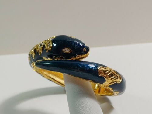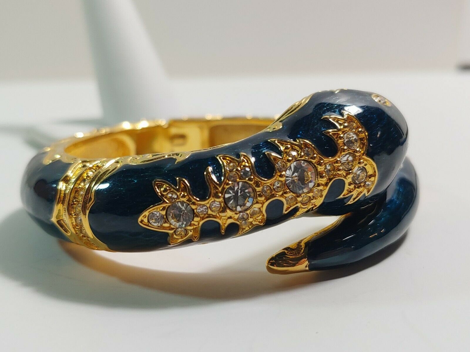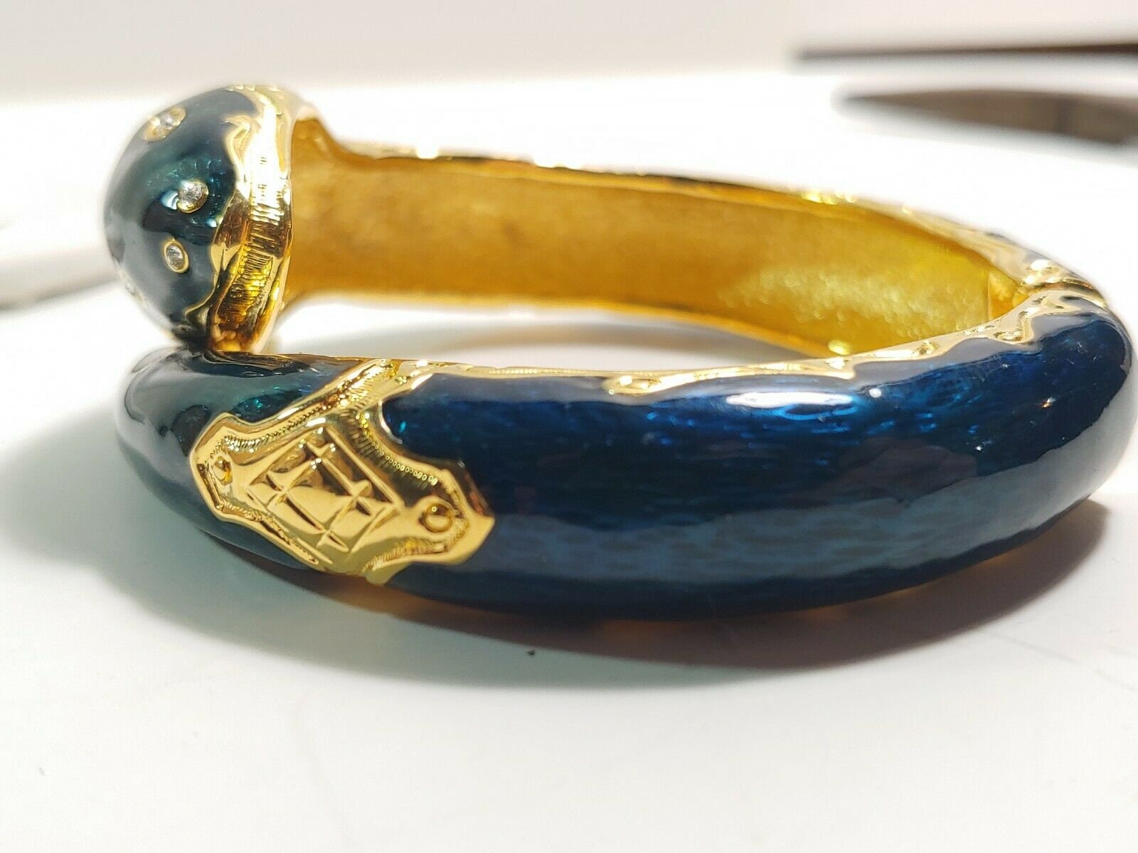 Gorgeous hinged bangle bracelet signed by Joan Rivers.Gold tone metal with stunning blue enamel. Accented with crystals. Fits 6.65 to 7.0 wrist. Perfect for the office, church or a special occasion. It would also make a great gift for someone. In Like New condition and priced to sell. Don't miss the opportunity to add this lovely signed bangle bracelet to your jewelry collection today. Buy it now.